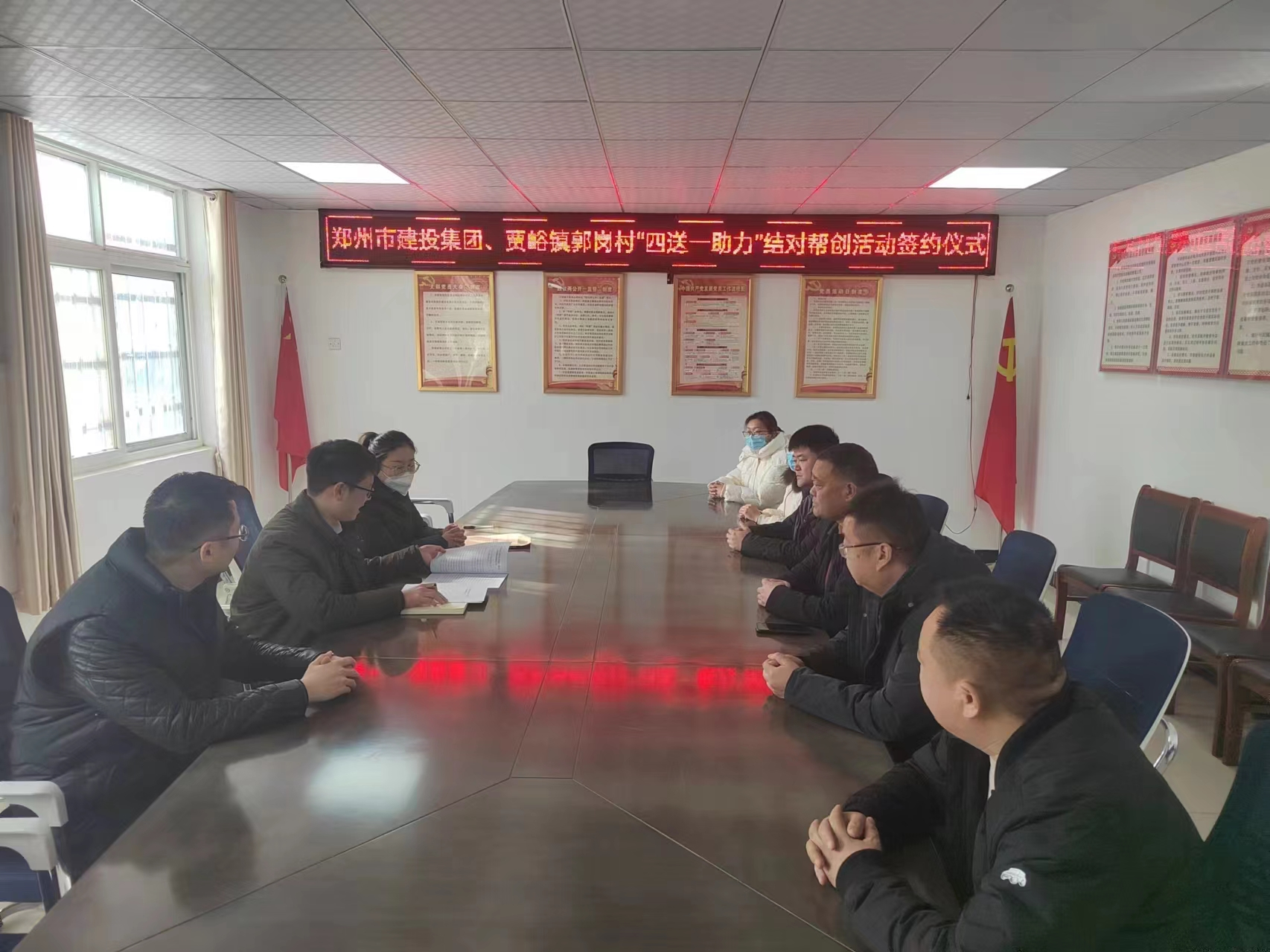 深入调研,制定帮扶内容“聚合力”。帮创工作组首先与郭岗村“两委”相关负责人、村民代表进行座谈交流,村支书张建华详细介绍了郭岗村乡村振兴、巩固脱贫攻坚成果、“五星”党支部创建等工作。赵少先表示,自2017年郑州市第四轮文明单位结对帮扶开始,建投集团与郭岗村结成帮扶对子,双方在帮扶农村精神文明创建工作中结下了深厚的友谊,大家一起同心协力真抓实干,绘就了乡村振兴新景色。在今后的工作中,建投集团将会一如既往地做好坚强后盾,提供力所能及的帮助。随后,双方就本轮帮创工作目标、具体措施、完成时限进行了深入探讨。赵少先指出,建投集团将结合郭岗村帮创需求,通过崇德向善、建设文化强村;情系群众、惠民修路先行;智能安防、守护乡村平安等措施助力乡村振兴,同时常态化开展好“送政策、送文化、送健康、送温暖”等志愿服务活动,预计3年共提供帮扶资金15万元,将“四送一助力”结对帮创工作做实做细。最后,双方共同签署了《郑州市各级文明单位“四送一助力”结对帮创活动协议书》,正式建立帮创关系。