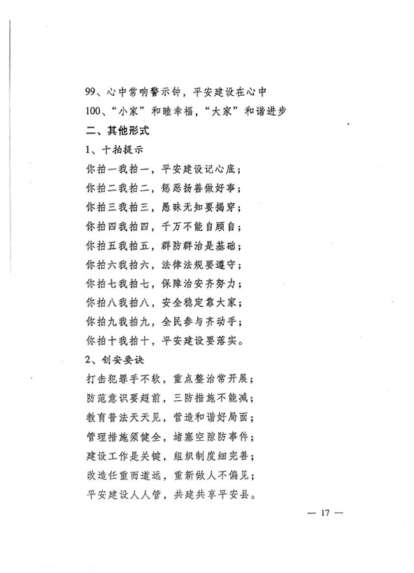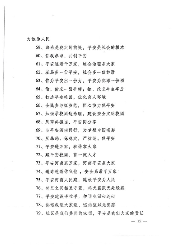 平安两字重千斤,社会稳定得民心。 创建平安人人有责,构建和谐人人参与。